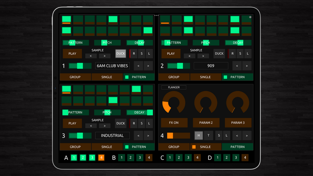 A layout for TouchOSC (iOS / Android app - https://hexler.net/products/touchosc) which provides complete control of all four Pattern Player devices inTraktor Pro 4.